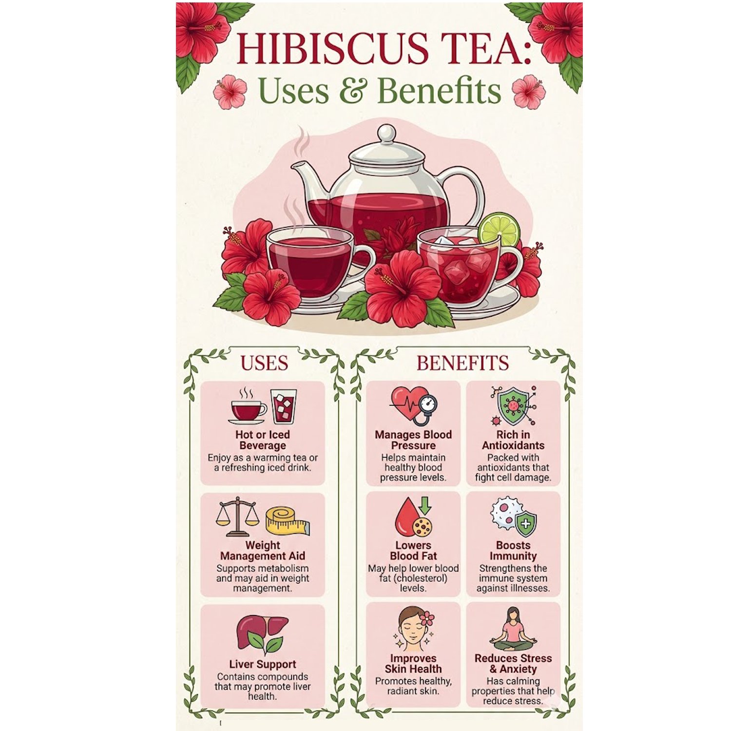 Hibiscus Tea is also beneficial for women’s wellness. It supports hormonal balance and may help reduce discomfort during menstrual cycles when consumed regularly. The high Vitamin C content strengthens the immune system and helps the body fight seasonal illnesses.