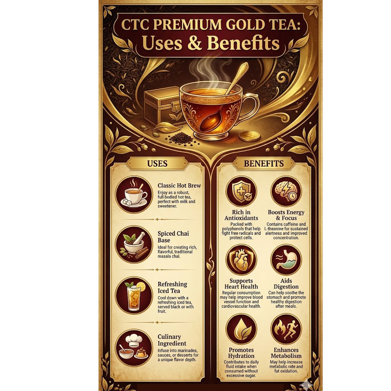 Premium Gold CTC Tea provides a natural energy boost that helps you stay active, alert, and focused throughout the day. Its strong brew stimulates the mind, making it an ideal choice for work mornings and long days.